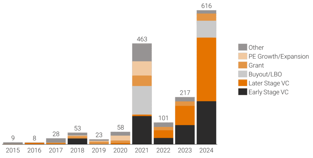 Investment in thermal energy storage has accelerated in recent years as technical progress and customer demand have improved project bankability. Since 2020, sector funding has grown and shifted toward later-stage investors, reflecting greater confidence in TES’s readiness for commercial deployment.