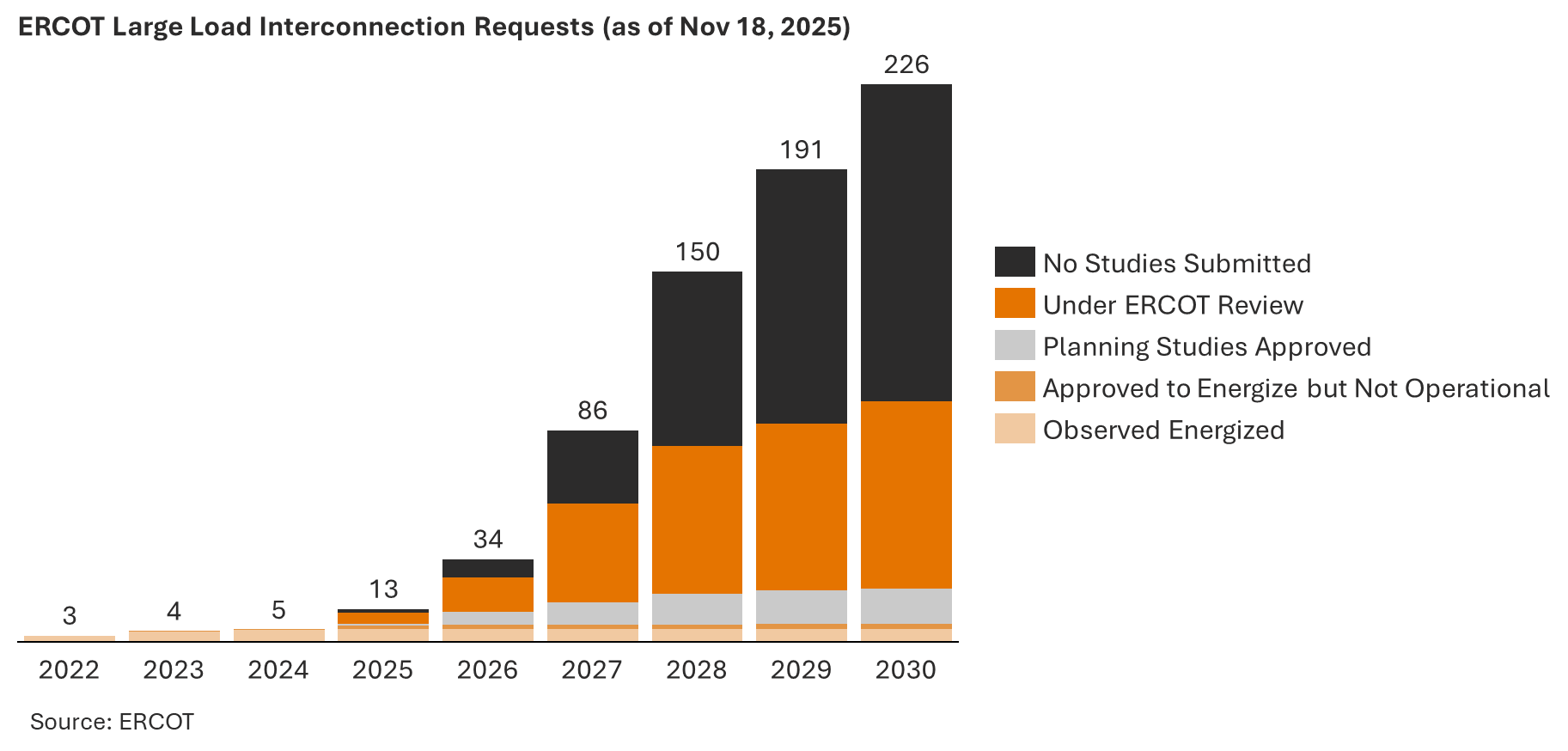 In 2025, the digital aspirations of data centers collided with the physical reality of the U.S. power system. Consider this: ERCOT is now tracking ≈226 GW of Large Loads seeking interconnection, versus 63 GW in December 2024 (ERCOT). 73% of requests are data centers, and 57% of the 2030 requests have yet to submit a study.