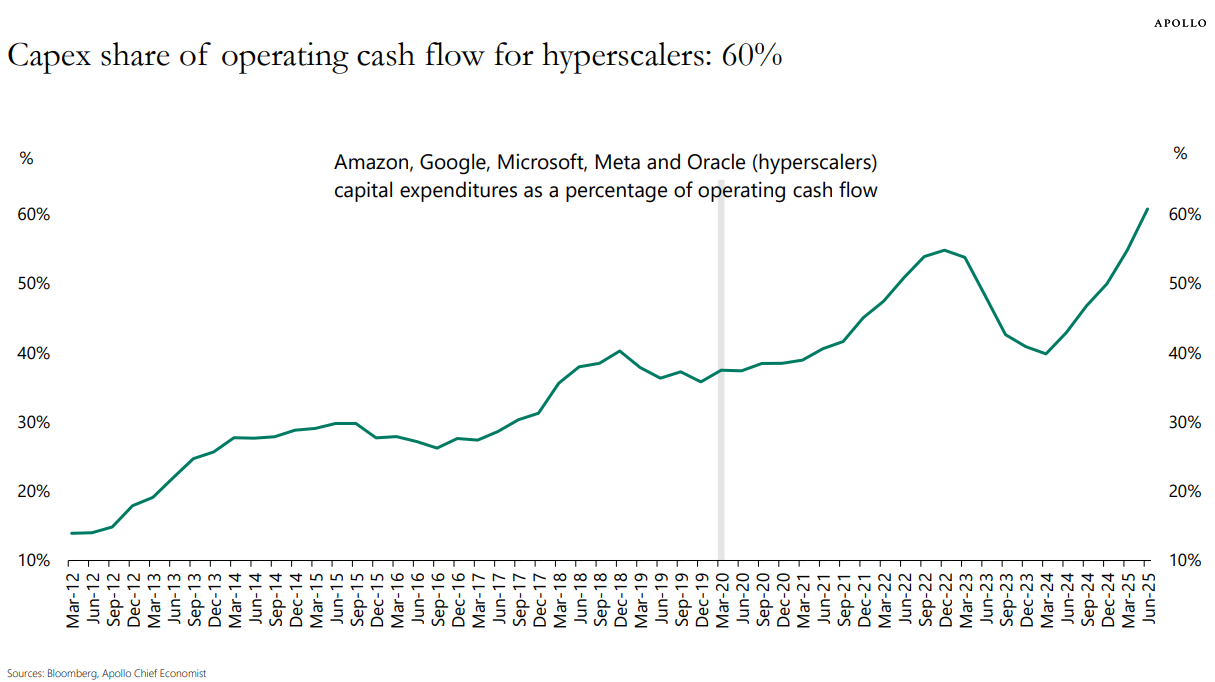 Some 70% of the ERCOT large-load queue is data centers, and the capex share of operating cash flow for hyperscalers has now risen to 60% (Apollo).