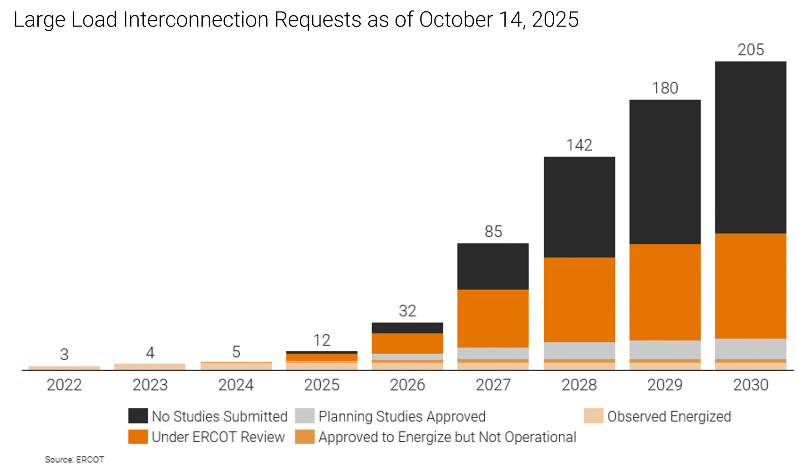 The scale of today’s load growth is, however, unprecedented in modern power markets. ERCOT’s large-load interconnection queue has swelled to 205 GW, up from just 56 GW a year ago (ERCOT). As Nat Bullard noted earlier this year: “Electricity demand used to rise like the tide. Slow and steady. Now it comes in waves.” This is not isolated to Texas: PJM utilities have committed to serve twice as much new large load demand as there is new power generation being planned to support it (Wood Mackenzie). These load forecasts are unbelievable in a very literal sense (The AI Bubble’s Impossible Promise, NRG), although even much smaller figures will lead to tightness in many markets. The magnitude of this wave may well redefine how load and generation connect to the grid. More on that in this month’s policy section.