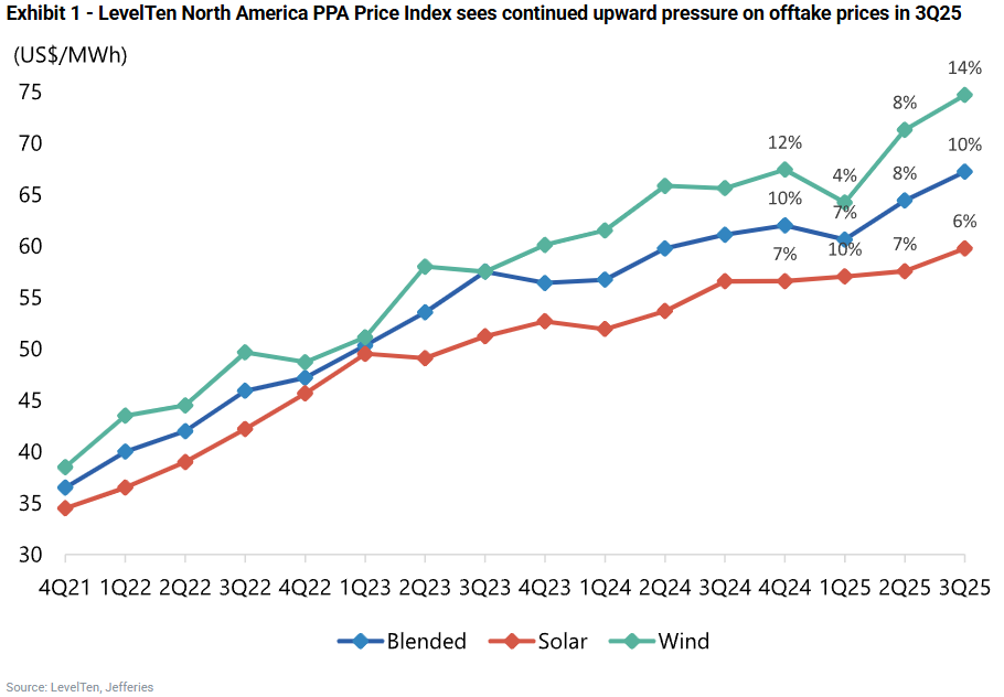 LevelTen’s North America PPA Price Index shows year-over-year increases of 6% for solar and 14% for wind PPAs. LevelTen attributes much of the 3Q PPA price increase to higher US tariffs on input factors like steel/aluminium, while Trio blames financing costs (Utility Dive).