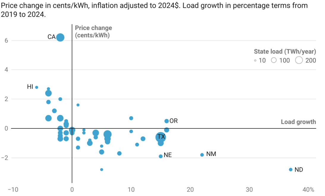 Over the last 5 years, states with the highest growth saw average prices decline in inflation-adjusted terms whereas states with load reduction / contraction often saw prices increase (Lawrence Berkeley National Laboratory).
